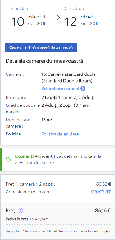 - Cazare 1: Metropolitan Hotel Berlin – 86 euro / doua nopti / camera dubla / taxe incluse