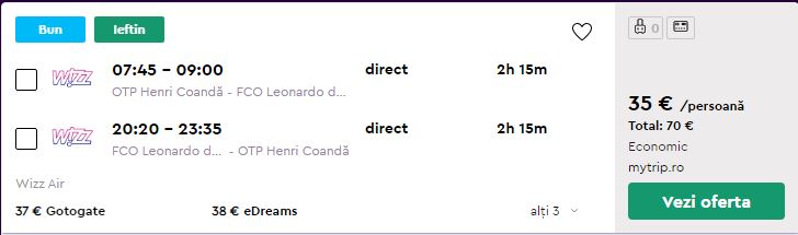 - Zbor: Bucuresti – Roma, 35 euro, dus-intors, operat de Wizz Air