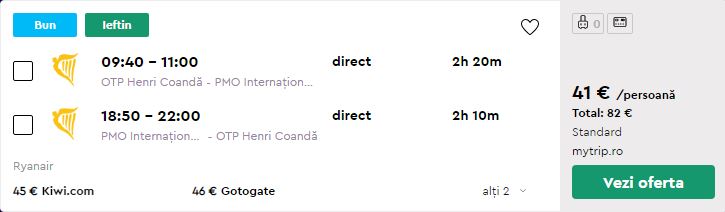 - Zbor: Bucuresti – Palermo, 41 euro, dus-intors, operat de Ryanair