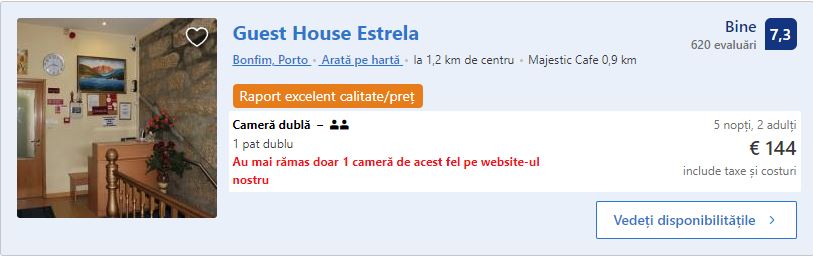 - Cazare 1: Guest House Estrela – 144 euro / 5 nopti / camera dubla