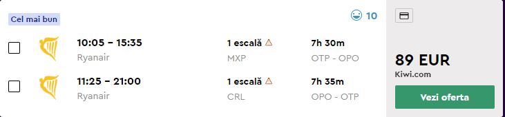 - Zbor: Bucuresti – Porto, 89 euro, dus-intors, garantie Kiwi
