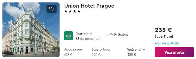 - Cazare (opt. 2) Union Hotel Prague – 233 euro / 4 nopti / camera dubla