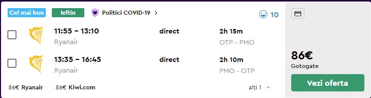 - Zbor: Bucuresti – Palermo, 86 euro, dus-intors, operat de Ryanair