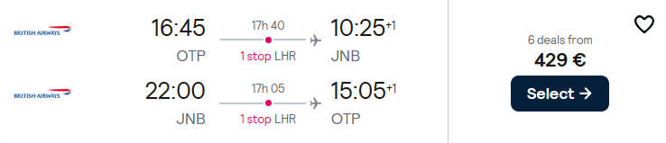 - Exemplu: Bucuresti – Johannesburg , 429€, dus-intors, operat de British Airways