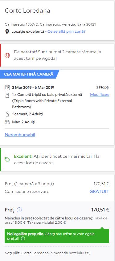- Cazare 2: Venice Star (centrul orasului) – 200 euro / 3 nopti / camera dubla