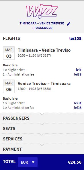 - Zbor: Timisoara – Venetia, 25 euro, dus-intors, operat de Wizz Air