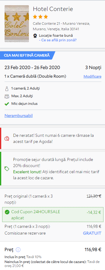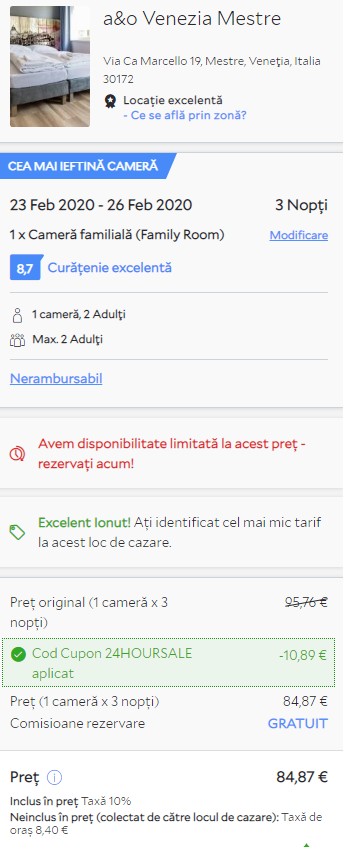 - Cazare 2: Ao Hotel Venezia Mestre – 93 euro / 3 nopti / camera dubla