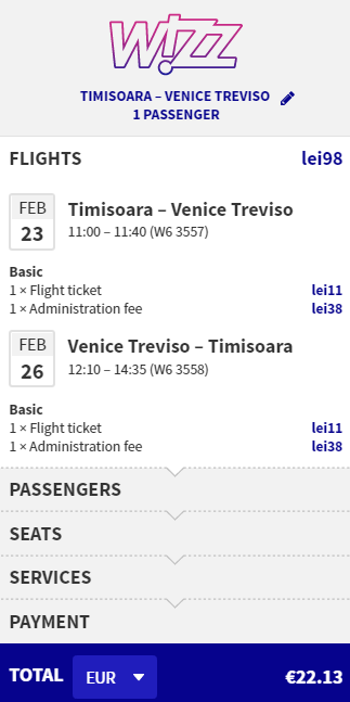 - Zbor: Timisoara – Venetia, 22 euro, dus-intors, operat de Wizz Air