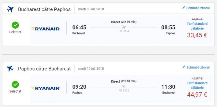 - Zbor: Bucuresti – Paphos, 78 euro, dus-intors, operat de Ryanair