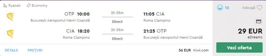 - Zbor: Bucuresti – Roma, 29 euro, dus-intors, operat de Ryanair