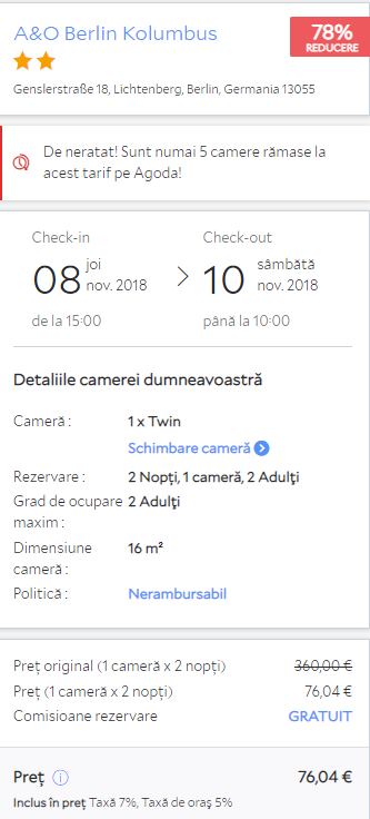 - Cazare 1: A&O Berlin Kolumbus – 76 euro / 2 nopti / camera dubla