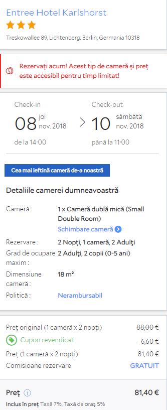 - Cazare 2: Entree Hotel Karlshorst – 81 euro / 2 nopti / camera dubla