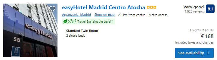 - Cazare (opt. 2) easyHotel Madrid Centro Atocha – 168 euro / 3 nopti / camera dubla