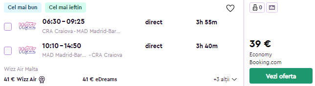 - Zbor Craiova – Madrid, 39 euro, dus-intors, operat de Wizz Air