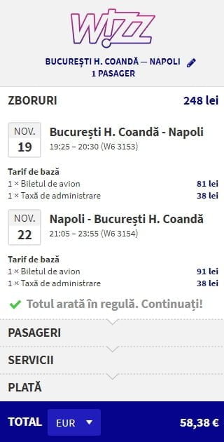 - Bucuresti – Napoli, 58 euro, dus-intors, operat de Wizz Air