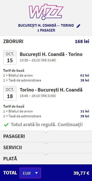 - Bucuresti – Torino, 40 euro, dus-intors, operat de Wizz Air