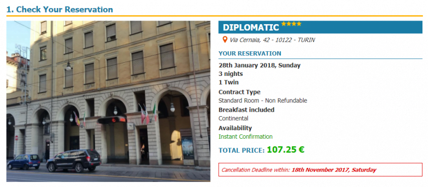 - Diplomatic Hotel Turin 4* (cotat cu 8/10 pe Booking) – 107 euro / 3 nopti / camera dubla / mic dejun inclus