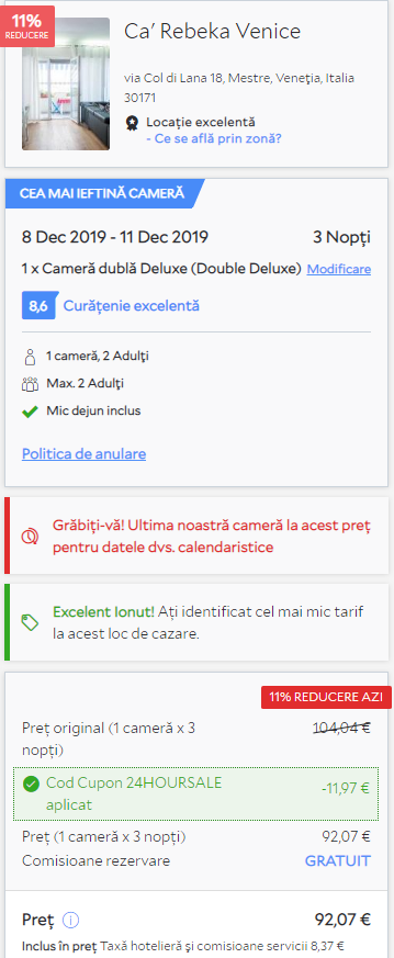 - Cazare 2: Ca’Rebeka Venice – 92 euro / 3 nopti / camera dubla / mic dejun inclus