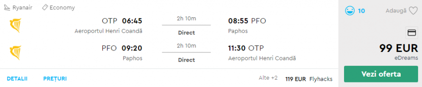 - Zbor: Bucuresti – Paphos, 99 euro, dus-intors, operat de Ryanair