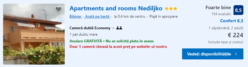 - Cazare 1: Apartments And Rooms Nediljko – 224 euro / 7 nopti / camera dubla