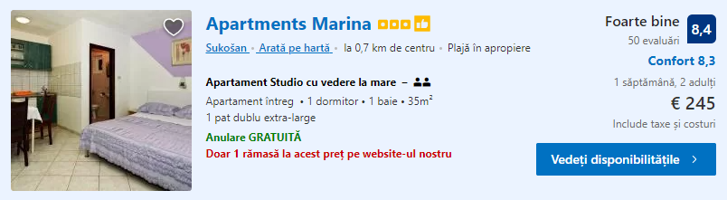 - Cazare 2: Apartments Marina – 245 euro / 7 nopti / camera dubla
