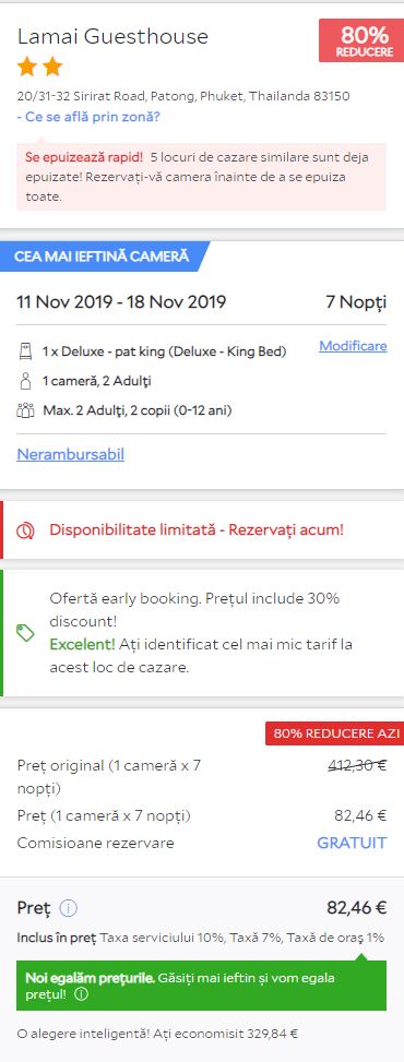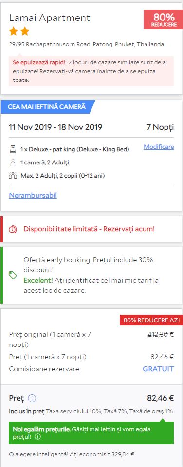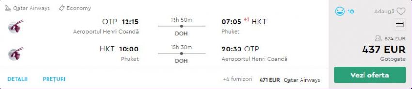 - Zbor: Bucuresti – Phuket, 437 euro, dus-intors, operat de Qatar Airways, bagaj de cala inclus