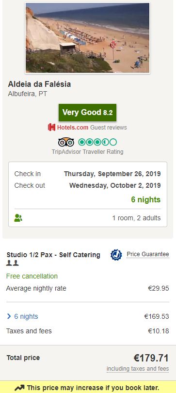 - Cazare 1 (Albufeira): Aldeida Da Falesia – 180 euro / 6 nopti / camera dubla
