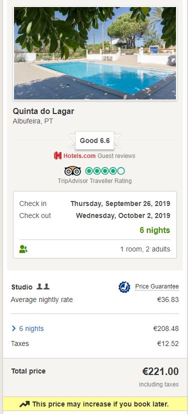 - Cazare 2 (Albufeira): Quinta do Lagar – 221 euro / 6 nopti / camera dubla