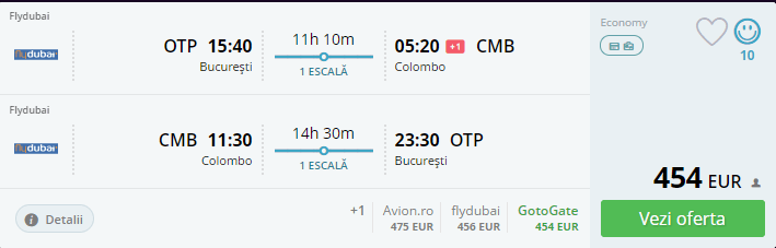 - Bucuresti – Colombo, 456 euro, dus-intors, operat de flydubai, bagaj de cala inclus