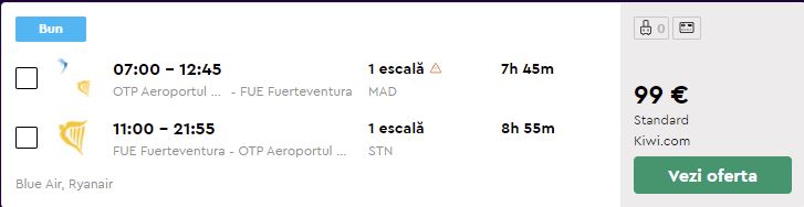 - Zbor: Bucuresti – Fuerteventura, 99 euro, dus-intors, operat de Blue Air si Ryanair