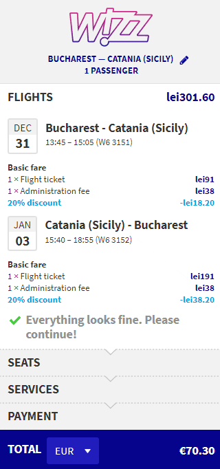 - Bucuresti – Catania, 70 euro, dus-intors, operat de Wizz Air