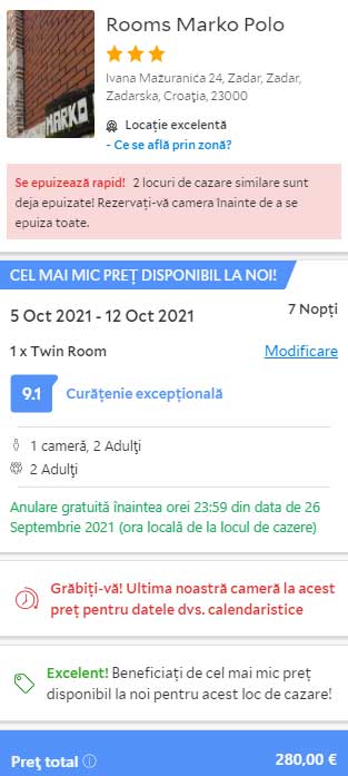 - Cazare 1: Rooms Marko Polo – 280 euro / 7 nopti / camera dubla