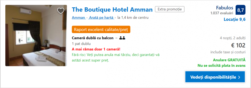 - Cazare 2: The Boutique Hotel Amman – 102 euro / 4 nopti / camera dubla