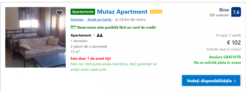 - Cazare 3: Mutaz Apartment – 102 euro / 4 nopti / camera dubla