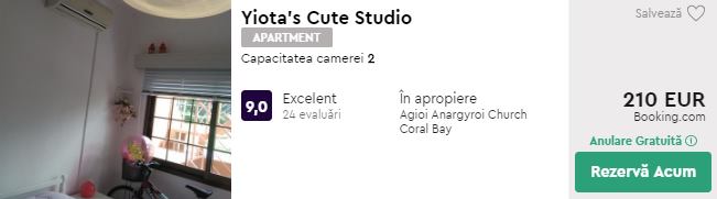 - Cazare 1: Yiota’s Cute Studio – 210 euro / 7 nopti / camera dubla
