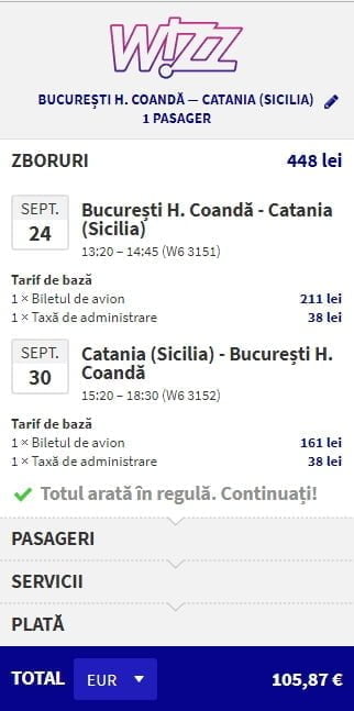 - Bucuresti – Catania, 106 euro, dus-intors, operat de Wizz Air