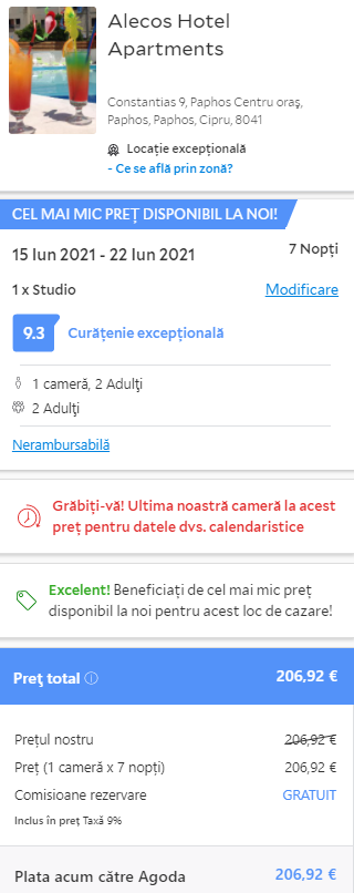 - Cazare 1: Alecos Hotel Apartments – 207 euro / 7 nopti / camera dubla