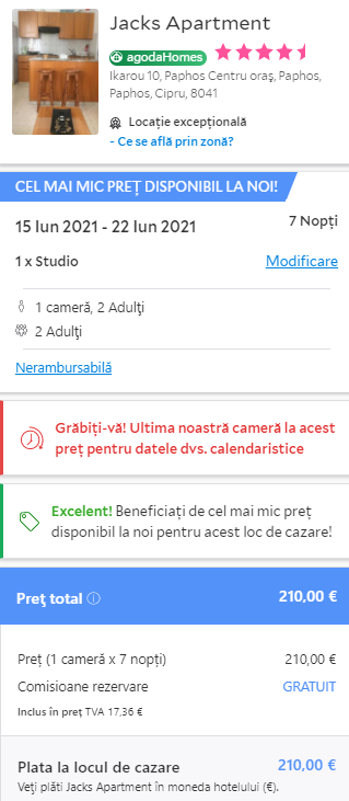 - Cazare 2: Jacks Apartment – 210 euro / 7 nopti / camera dubla