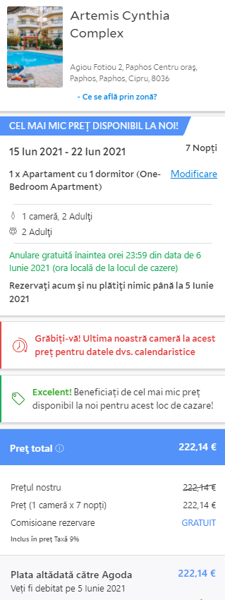 - Cazare 3: Artemis Cynthia Complex – 222 euro / 7 nopti / camera dubla