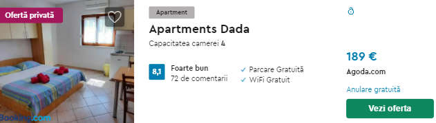 - Cazare (opt.1) Apartments Dada – 189 euro / 7 nopti / camera dubla