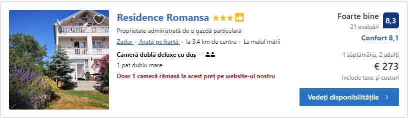 - Cazare 3: Residence Romansa (Zadar) – 273 euro / 7 nopti / camera dubla