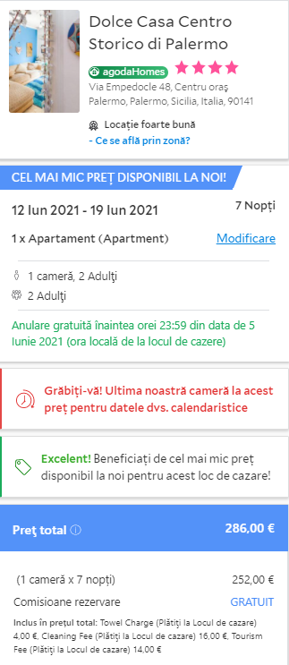 - Cazare 3: Dolce Casa Centro Storico di Palermo – 286 euro / 7 nopti / camera dubla