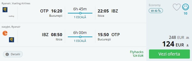 - Bucuresti – Ibiza, 124 euro, dus-intors (garantie Flyhacks)
