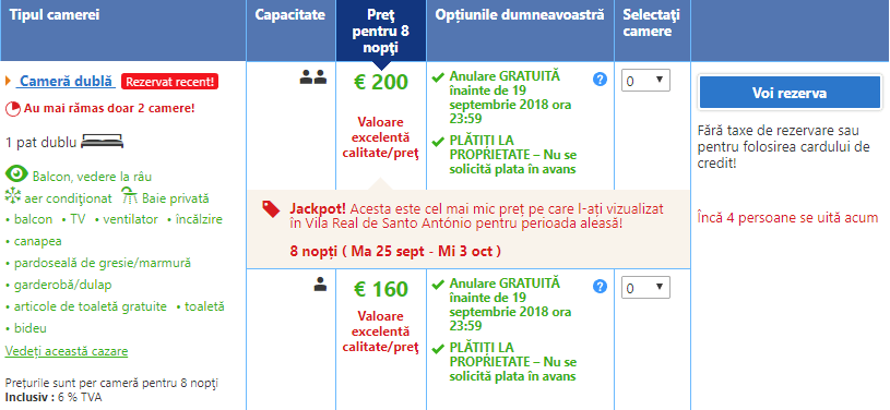 Trebuie sa intelegi ca exista un numar limitat de bilete de avion la pretul din simulare, dar am strans pentru tine multe alte date disponibile. Le gasesti imediat sub tabel, trebuie doar sa iti cauti cazare in perioada care iti convine. Pentru asta, iti recomandam sa folosesti motorul de cautare din sidebar sau sa verifici disponibilitatea cazarilor propuse de noi in simulare.