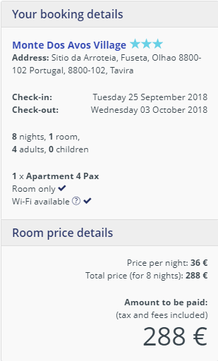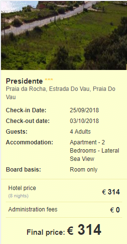 - Cazare 1 (4 pax): Monte Dos Avos Village – 288 euro / 8 nopti / camera dubla / taxe incluse