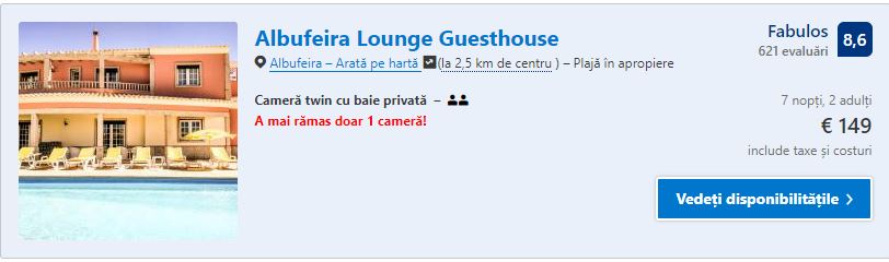 - Cazare 1 (Albufeira): Albufeira Lounge Guesthouse – 149 euro / 7 nopti / camera dubla
