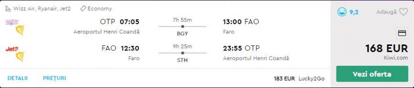 - Zbor: Bucuresti – Faro, 168 euro, dus-intors, garantie Kiwi