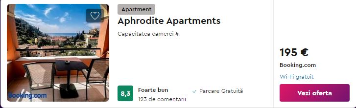 - Cazare (opt. 1): Aphrodite Apartments – 195 euro / 6 nopti / camera dubla