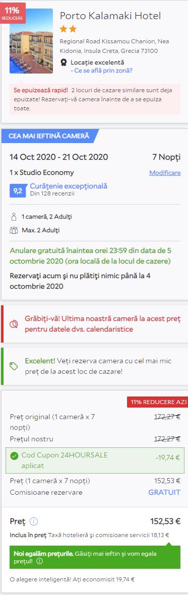 - Cazare 1: Porto Kalamaki Hotel – 153 euro / 7 nopti / camera dubla