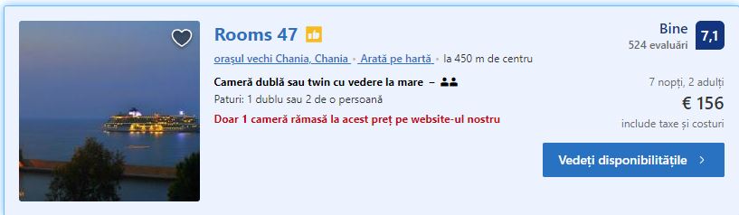 - Cazare 2: Rooms 47 – 156 euro / 7 nopti / camera dubla